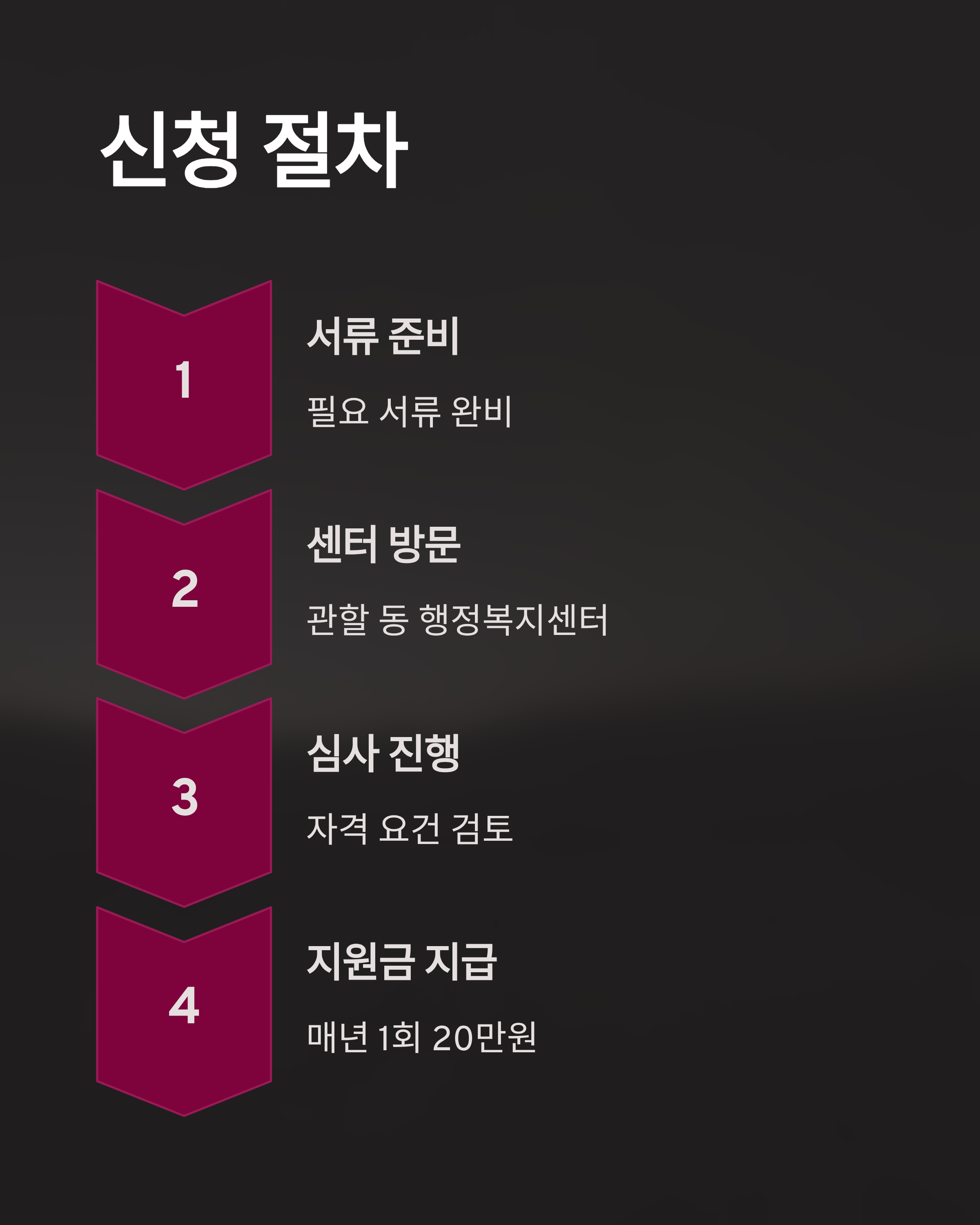 효도수당 신청은 간단합니다. 신청자는 거주지 관할 동 행정복지센터를 방문하여 필요한 서류를 제출해야 합니다. 필요한 서류에는 신분증, 주민등록등본, 소득 및 재산 증빙서류가 포함됩니다. 신청 후에는 심사를 거쳐 지원금이 지급됩니다.