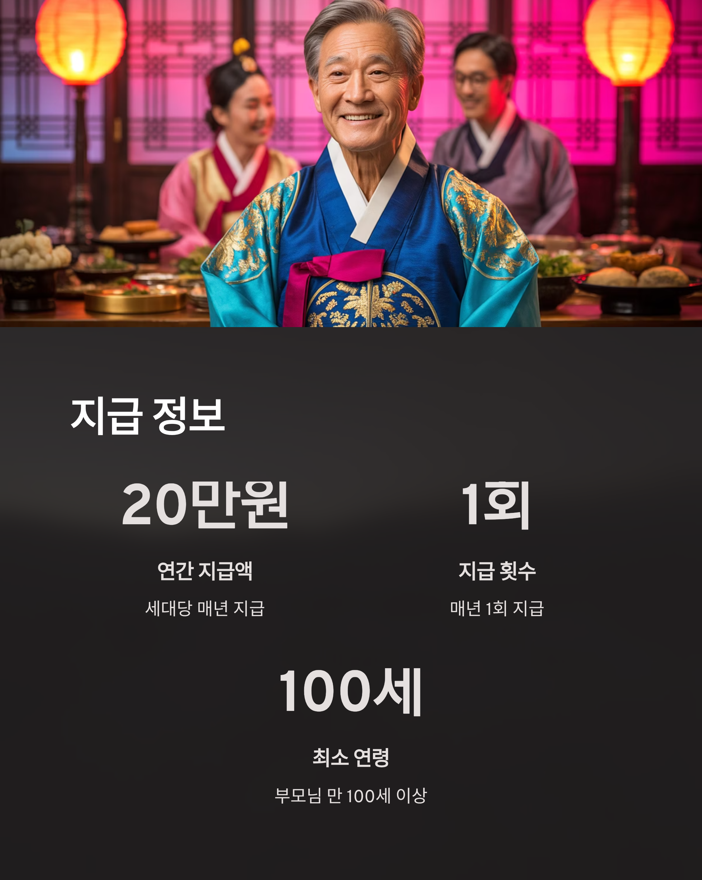 - 효도수당은 매년 세대당 20만원이 지급됩니다.